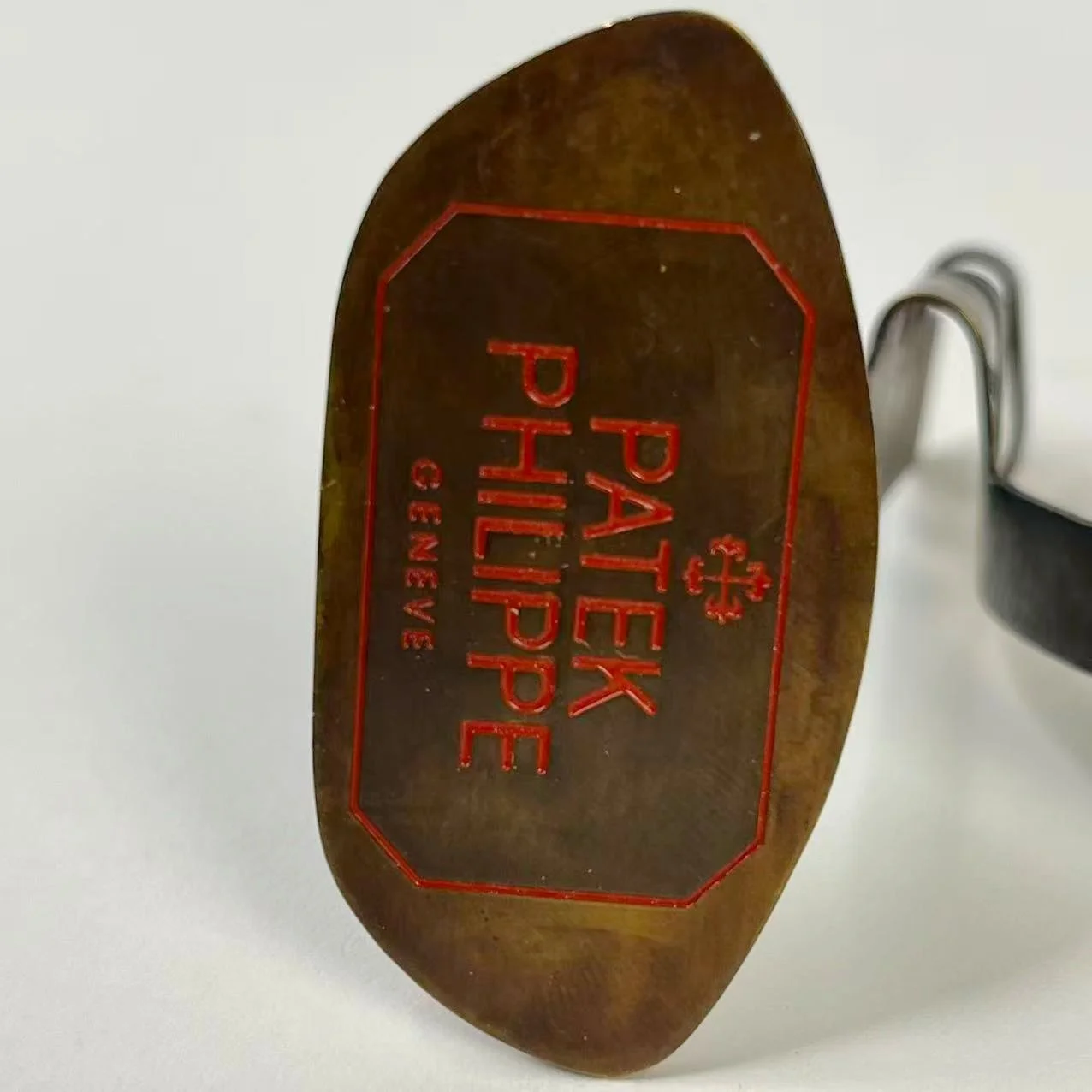 The stand is in excellent vintage condition, exhibiting significant patina, oxidation, and surface darkening throughout the metal consistent with age and long-term display use. The engraved branding remains visible, though softened by wear. Structural integrity is sound, and the piece displays properly, yet the visible aging contributes to its authenticity as a true vintage presentation artifact.